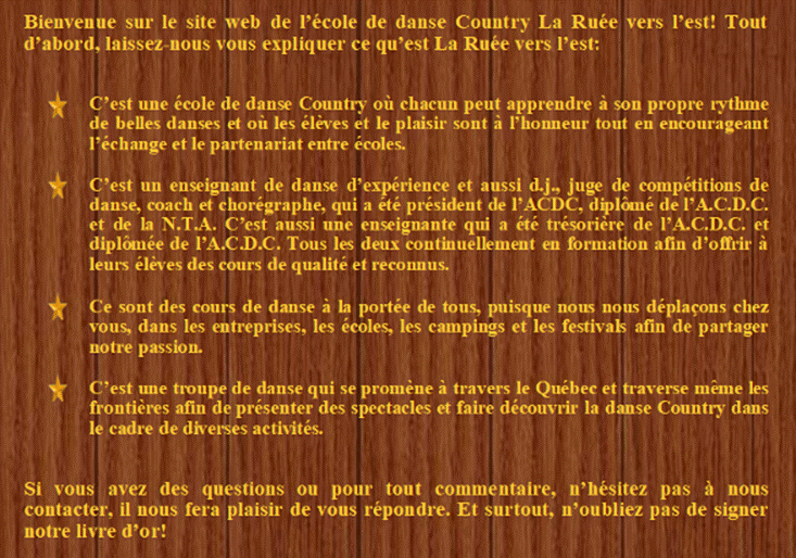 Bienvenue sur le site web de l’école de danse Country La Ruée vers l’est! Tout d’abord, laissez-nous vous expliquer ce qu’est La Ruée vers l’est: